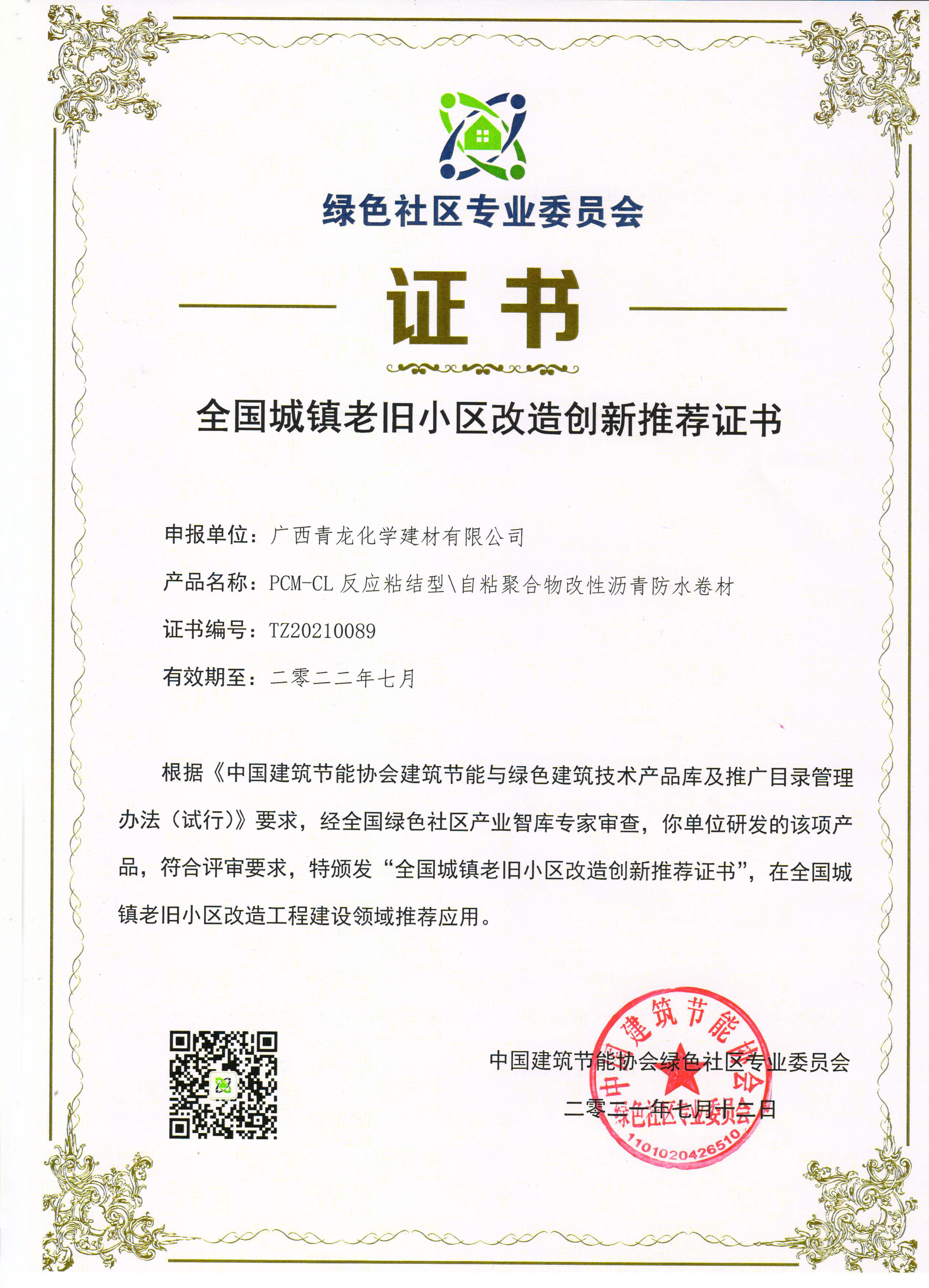 全國(guó)城鎮(zhèn)老舊小區(qū)改造創(chuàng)新推薦證書