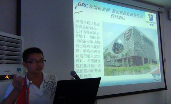 在培訓(xùn)會(huì)上,蘇小麗全面地介紹了公司生產(chǎn)的各類藝術(shù)產(chǎn)品,并對(duì)它們的生產(chǎn)工藝、安裝細(xì)節(jié)及應(yīng)該注意的問題進(jìn)行了詳細(xì)的解說。龍江則主講《GRC在現(xiàn)在工程中的應(yīng)用》,從GRC外墻板、裝飾構(gòu)件以及園林景觀方面的案例出發(fā),向與會(huì)的人員展現(xiàn)了GRC在工程中的魅力。不少參加會(huì)議的人員都表示受益匪淺,“現(xiàn)在對(duì)公司生產(chǎn)的產(chǎn)品有了一個(gè)系統(tǒng)的了解,在GRC的安裝工藝方面也增長(zhǎng)了不少見識(shí),相信對(duì)以后的工作會(huì)有很大的幫助。”