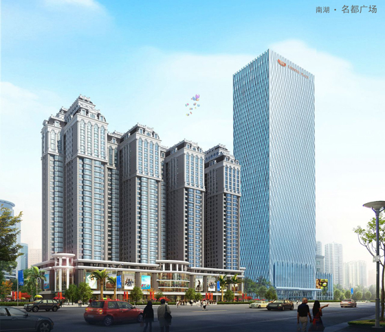 南湖名都廣場(chǎng)是南寧港昌房地產(chǎn)有限公司投資興建的高層建筑綜合體,集住宅、商業(yè)、寫字樓、酒店為一體,總建筑面積約為30.5萬(wàn)平方米。項(xiàng)目分為兩個(gè)部分,其中A座為皇冠假日酒店和高檔寫字樓,其建筑外立面為水波幕墻設(shè)計(jì),由數(shù)以千計(jì)的雙層中空l(shuí)ow-e幕墻純手工拼接而成。水波幕墻具有減少光污染的作用,它利用光漫反射原理裝成,在滿足樓宇采光的同時(shí),極大地降低了光污染,更加環(huán)保從而降低能耗。