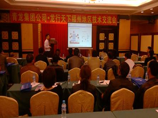 在兩個半小時的推廣會中,青龍建材集團(tuán)營銷總監(jiān)王定中以福州的建材市場的現(xiàn)狀為例,為大家解析了建材行業(yè)未來的發(fā)展前景,并就青龍建材公司“一個品牌,四門生意”的招商加盟政策做了詳細(xì)的介紹。福建大區(qū)域經(jīng)理周炳陽工程師則深入地剖析了青龍牌