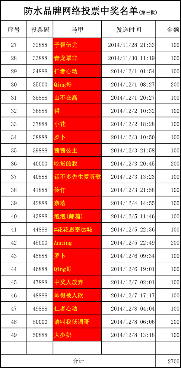 第三批中獎名單公布如下:子胥伍尤、青龍覃非、仁者心動、Qing哥、山不在高、哲、小花、羅卜、茜茜公主、吃貨的我、話不多先生愛聽歌、伶仃、奈落、泡泡(郵箱)、#花花思密達#&、Anning、羅卜、Qing哥、帥得被人砍、仁者心動、請叫我低調(diào)哥、大少奶。恭喜他們,也請大家繼續(xù)支持青龍,為青龍投票!