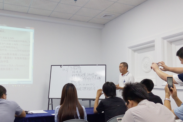 會議的之后,為提升公司業(yè)務人員防水等專業(yè)水平,培養(yǎng)解決各種復雜防水難題的能力和自信心,公司董事長宋敦清先生親自言傳身教,以地下室底板、地下室頂板、地下室側墻、屋面等防水設計方案為參照,引導大家共同設計出最有效,最經濟的防水保溫設計,鼓勵大家轉變觀念,靈活應用。宋總的講解讓大家受益匪淺,也深深理解了防水專業(yè)知識的重大意義。