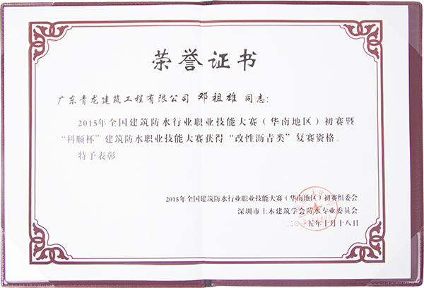 10月17日至18日,由中國建筑防水協(xié)會(huì)主辦、深圳市土木建筑學(xué)會(huì)防水專業(yè)委員會(huì)承辦的建筑防水職業(yè)技能大賽暨2015全國建筑防水行業(yè)職業(yè)技能大賽(華南地區(qū))在廣東高明舉行。來自全國的12家防水企業(yè)32位選手參加了比賽,青龍公司員工鄧祖雄先生憑借在改性瀝青和高分子防水卷材上的過硬表現(xiàn),順利晉級。