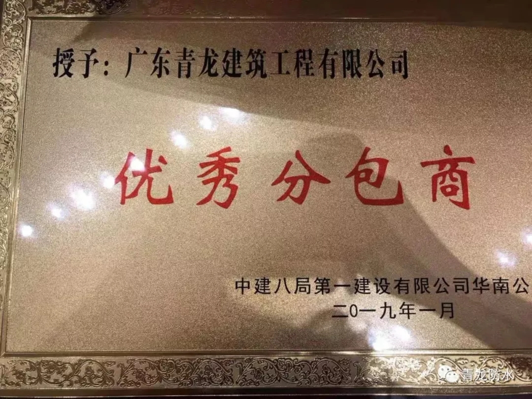 2019年1月,在中建八局第一建設(shè)有限公司華南公司2018年度優(yōu)秀分包商座談會(huì)上,我司喜獲"優(yōu)秀分包商"獎(jiǎng)項(xiàng),高度彰顯了青龍公司卓越的技術(shù)實(shí)力以及優(yōu)質(zhì)的服務(wù)能力。