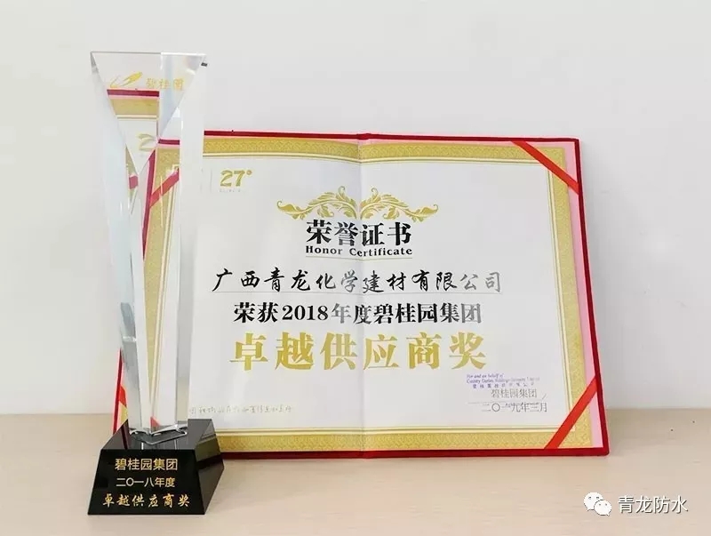 2019年3月7日下午,正值首屆"建筑防水工技能實(shí)操大賽"鏖戰(zhàn)正酣,在碧桂園集團(tuán)2018年度供應(yīng)商大會(huì)上,青龍公司憑借過硬的產(chǎn)品質(zhì)量和良好的企業(yè)服務(wù)體系,喜獲2018年度"卓越供應(yīng)商獎(jiǎng)"稱號(hào)。