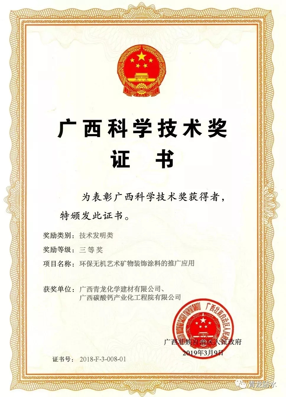 4月9日在廣西科學(xué)技術(shù)獎(jiǎng)勵(lì)大會(huì)上,青龍公司榮獲2018 年度獲得廣西科學(xué)技術(shù)獎(jiǎng)技術(shù)發(fā)明類三等獎(jiǎng)。