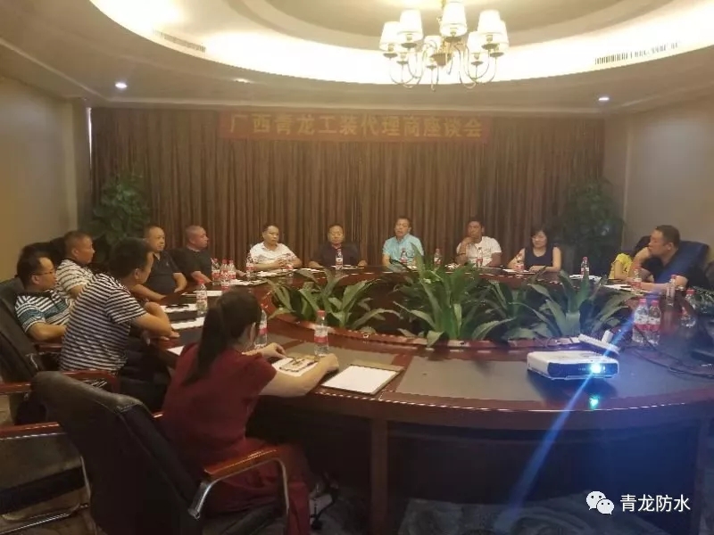為共謀發(fā)展,攜手共贏,2019年6月22日至23日,青龍防水廣西代理商座談會(huì)在廣西北海曼哈頓酒店順利召開。青龍公司董事長(zhǎng)宋敦清等青龍高層,以及南寧、北海、柳州、梧州、玉林、桂林、河池等市的青龍防水代理商,大家聚集一堂,通過分析總結(jié)、深入探討,對(duì)工程防水市場(chǎng)目前暴露出的問題、潛在的困難和發(fā)展瓶頸等課題進(jìn)行深入淺出的分析和研討。