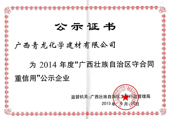 近日,青龍集團(tuán)廣西公司喜訊頻傳,獲得廣西區(qū)工商管理局頒發(fā)的2014年度廣西壯族自治區(qū)“守合同重信用企業(yè)”榮譽(yù)稱號(hào),市工商局特別頒發(fā)了證書。