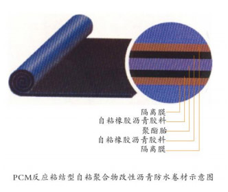 PCM反粘結(jié)型自粘聚合物改性瀝青防水卷材有兩種類型,一種是由合成橡膠和樹(shù)脂改性瀝青中加入特殊改性劑,聚酯胎為胎體,聚乙烯膜為表面材料或無(wú)膜(雙面自粘),采用硅油防粘隔離膜制成的;另一種是由PET聚酯膜(鍍鋁、鋁塑復(fù)合)、自粘橡膠瀝青料、硅油防粘隔離膜組成。