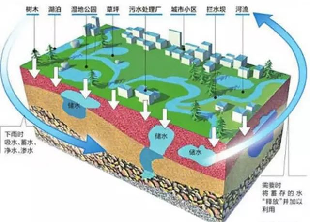 (1)海棉城市,是新一代城市雨洪管理概念,是指城市在適應(yīng)環(huán)境變化和應(yīng)對(duì)雨水帶來的自然災(zāi)害等方面具有良好的"彈性",也可稱之為"水彈性城市",國際通用術(shù)語為"低影響開發(fā)雨水系統(tǒng)構(gòu)建"。下雨時(shí)吸水、蓄水、滲水、凈水,需要的時(shí)候?qū)?chǔ)蓄的雨水"釋放"并加以利用。國務(wù)院辦公廳出臺(tái)"關(guān)于推進(jìn)海綿城市建設(shè)的指導(dǎo)意見"指出,采用滲、滯、蓄、凈、用、排等措施,將70%的降的就地消納和利用。