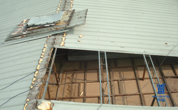 3.加大意外事件發(fā)生的概率。一旦遇上惡烈天氣,彩鋼瓦裂縫很容易被擴大,甚至整個屋面被掀起。