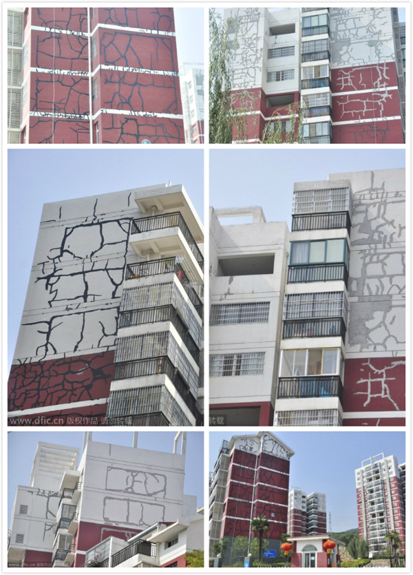 2014年10月10日,武漢市建成已經三年的江夏區(qū)武昌大道某小區(qū),房屋外墻就出現不同程度的裂縫,于是有的樓棟側墻整面用黑色防水涂料涂成框框以防滲漏,從遠處觀看,似乎給墻體綁上了“繃帶”。但是這樣的外墻“綁繃帶”真的能堵住滲漏嗎?